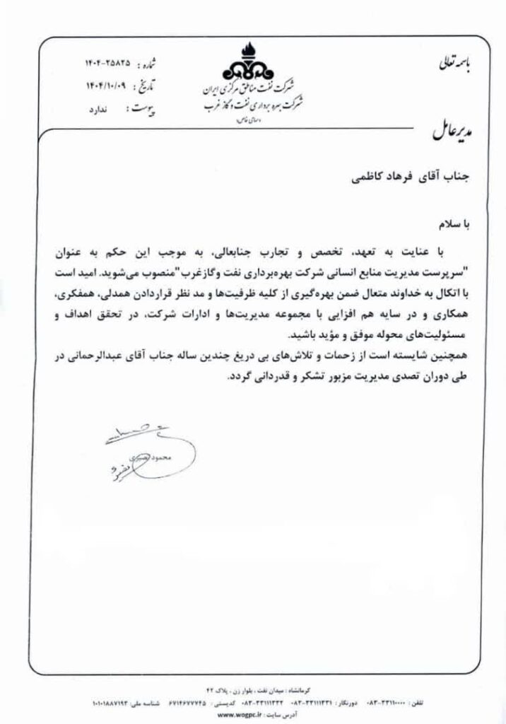انتصاب سرپرست جدید مدیریت منابع انسانی شرکت بهرهبرداری نفت و گاز غرب