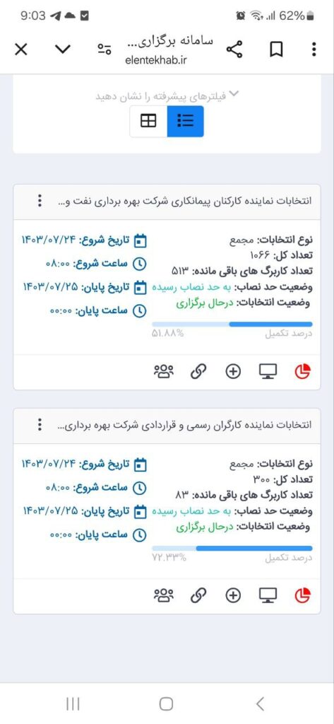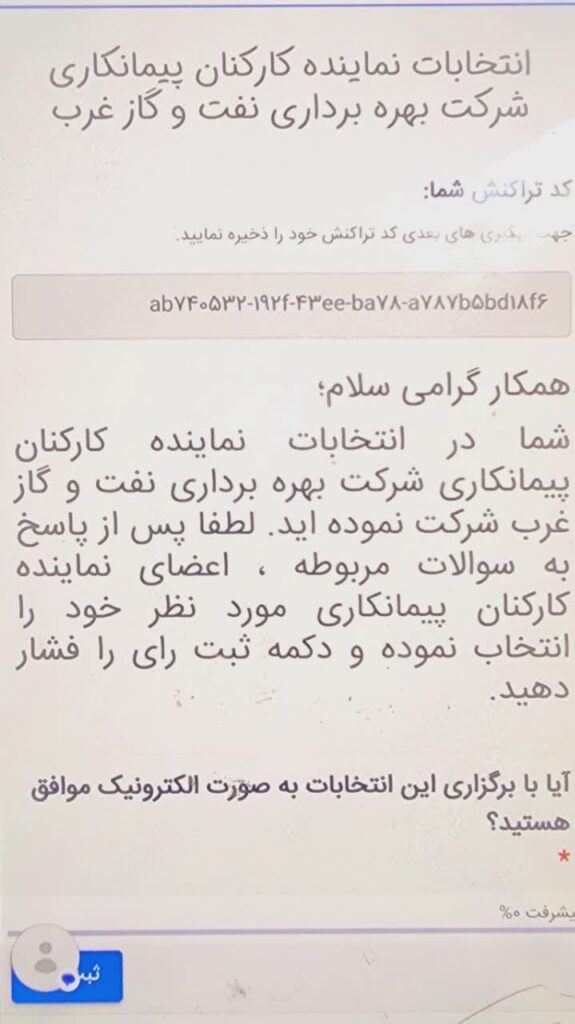به گزارش پایگاه اطلاع رسانی شرکت نفت مناطق مرکزی ایران انتخابات نمایندگان کارگری شرکت بهره برداری نفت و گاز غرب همزمان در ستاد کرمانشاه ، ایلام و مناطق عملیاتی تابعه(نفت شهر/تنگ بیجار و چشمه خوش/ دهلران/ سرکان مالکوه ) بصورت الکترونیک در شرکت نفت و گاز غرب برگزار شد.
