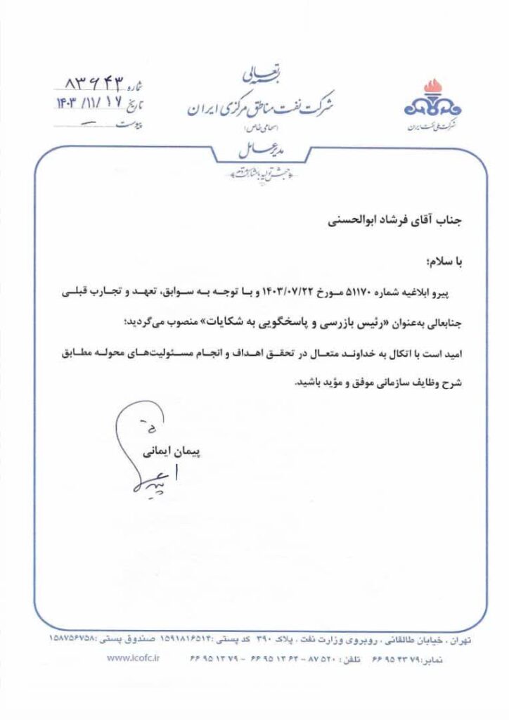 مدیرعامل شرکت نفت مناطق مرکزی ایران در حکمی «فرشاد ابوالحسنی» را بهعنوان رئیس بازرسی و پاسخگویی به شکایات این شرکت منصوب کرد.