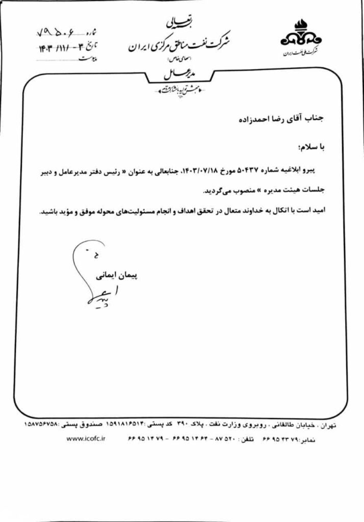 مدیرعامل شرکت نفت مناطق مرکزی ایران در حکمی «رضا احمدزاده» را بهعنوان رئیس دفتر مدیرعامل و دبیر جلسات هیئت مدیره این شرکت منصوب کرد.