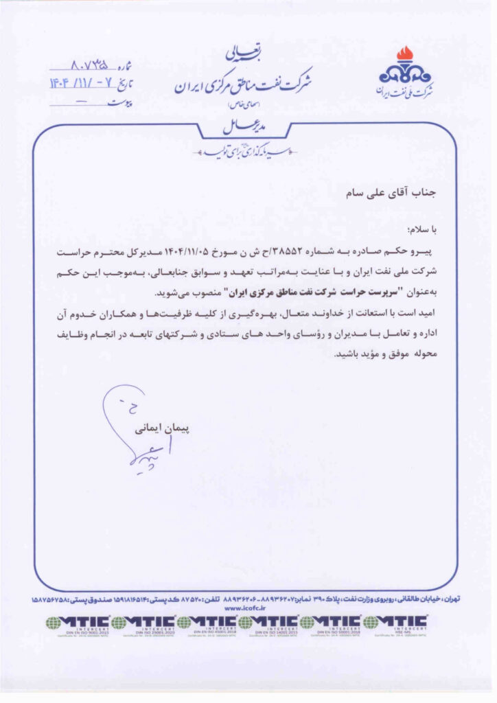 به گزارش پایگاه اطلاع رسانی نفت مناطق مرکزی ایران؛ پیمان ایمانی با صدور حکمی علی سام را به عنوان سرپرست حراست این شرکت منصوب کرد.