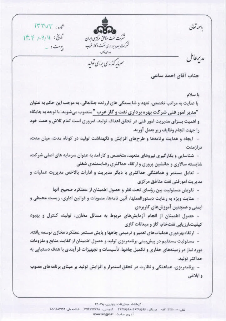 مدیرعامل شرکت بهره برداری نفت و گاز غرب در حکمی احمد ساعی را به عنوان مدیر امور فنی این شرکت منصوب کرد.