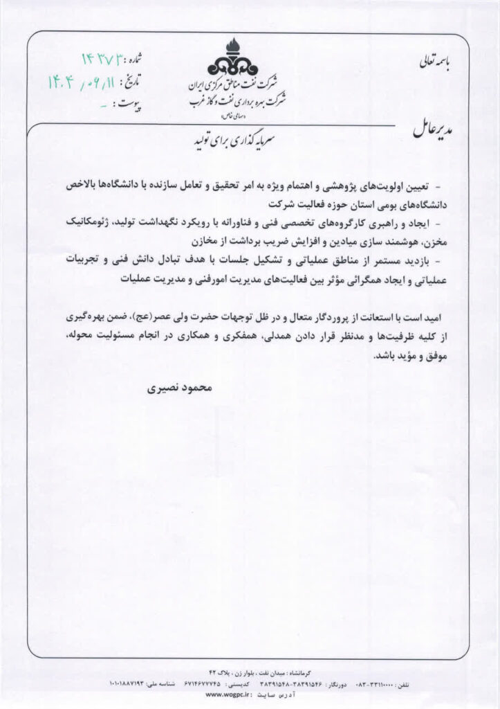 مدیر امور فنی شرکت بهره برداری نفت و گاز غرب منصوب شد