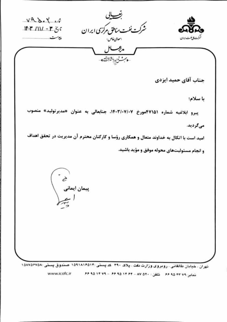 مدیرعامل شرکت نفت مناطق مرکزی ایران در حکمی «حمید ایزدی» را به‌عنوان مدیر تولید شرکت نفت مناطق مرکزی ایران منصوب کرد.