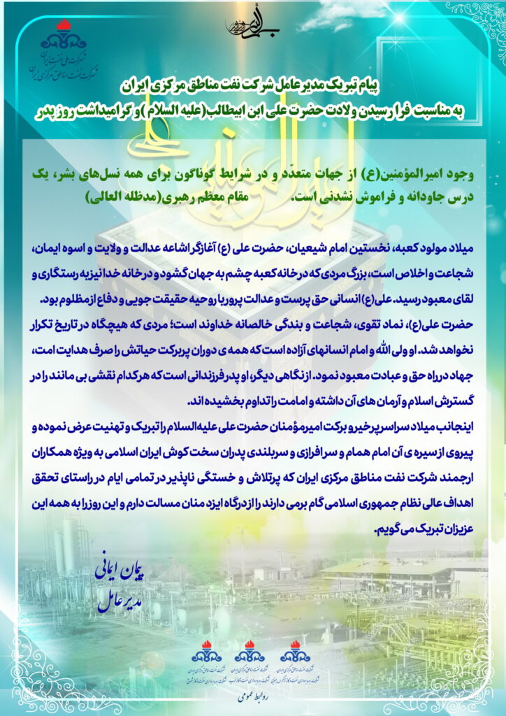 مدیر عامل شرکت نفت مناطق مرکزی ایران بمناسبت فرارسیدن ولادت با سعادت امام علی (علیه السلام)، گرامیداشت روز پدر و مقام مرد پیام تبریکی را بشرح زیر صادر نمود: