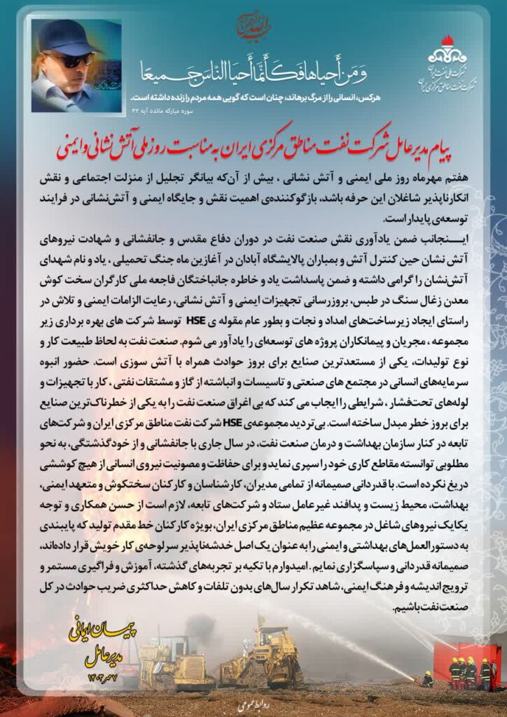 پیام مدیرعامل شرکت نفت مناطق مرکزی ایران به مناسبت روز ملی ایمنی و آتش نشانی