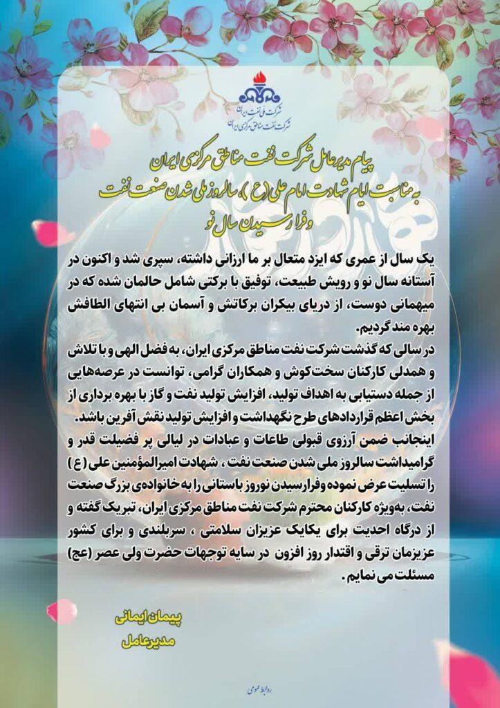 اینجانب ضمن آرزوی قبولی طاعات و عبادات در لیالی پر فضیلت قدر و گرامیداشت سالروز ملی شدن صنعت نفت، شهادت امیرالمؤمنین علی (ع) را تسلیت عرض نموده و فرارسیدن نوروز باستانی را به خانواده‌ی بزرگ صنعت نفت، به‌ویژه کارکنان محترم شرکت نفت مناطق مرکزی ایران، تبریک گفته و از درگاه احدیت برای یکایک عزیزان سلامتی، سربلندی و برای کشور عزیزمان ترقی و اقتدار روز افزون در سایه توجهات حضرت ولی عصر (عج) مسئلت می نمایم.