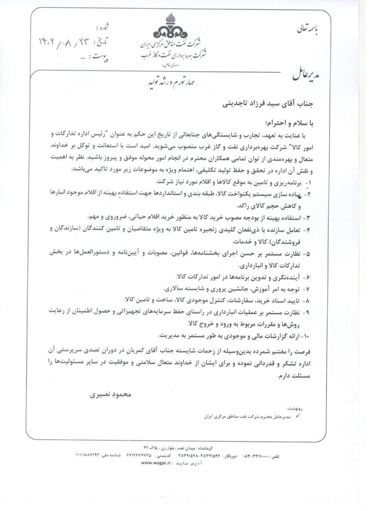 به گزارش پایگاه اطلاع رسانی شرکت نفت مناطق مرکزی ایران مهندس محمود نصیری مدیر عامل شرکت بهره برداری نفت و گاز غرب طی حکمی آقای سید فرزاد تاجدینی را به عنوان رئیس اداره تدارکات و امور کالا این شرکت منصوب کرد.