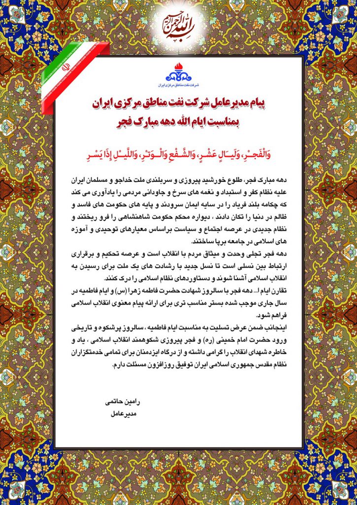 پیام تبریک مدیرعامل شرکت نفت مناطق مرکزی ایران بمناسبت ایام الله دهه مبارک فجر