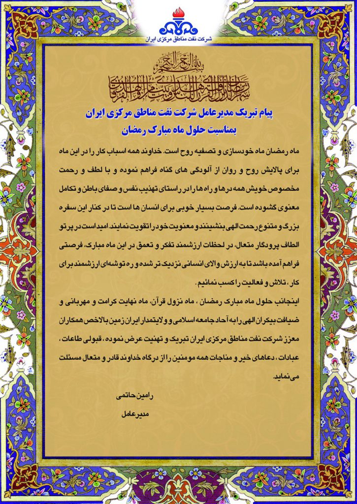 پیام تبریک مدیرعامل شرکت نفت مناطق مرکزی ایران به مناسبت حلول ماه مبارک رمضان