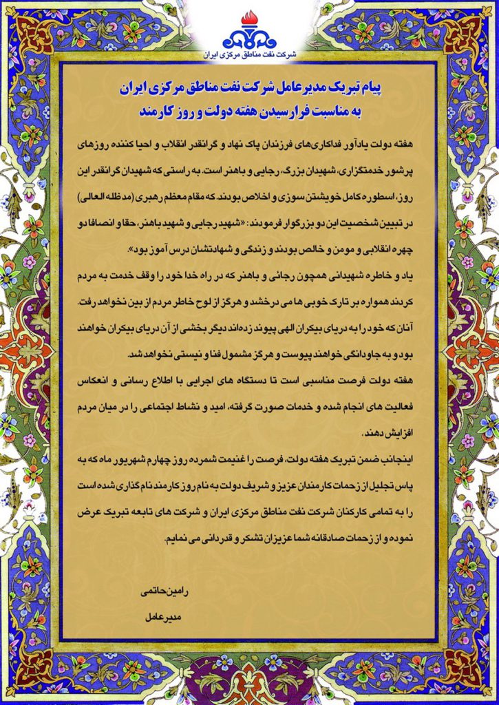 پیام تبریک مدیر عامل شرکت نفت مناطق مرکزی ایران بمناسبت فرارسیدن هفته دولت و روز کارمند