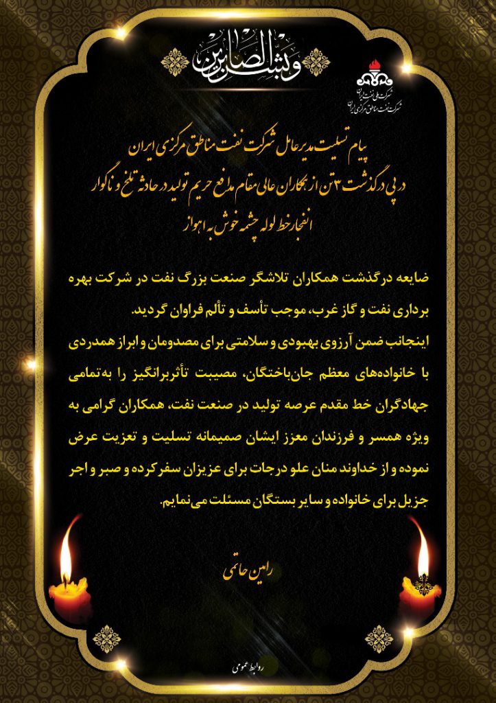 پیام تسلیت مدیرعامل شرکت نفت مناطق مرکزی ایران در پی درگذشت ۳ تن از همکاران عالیمقام مدافع حریم تولید در حادثه تلخ و ناگوار انفجار خط لوله چشمه خوش به اهواز