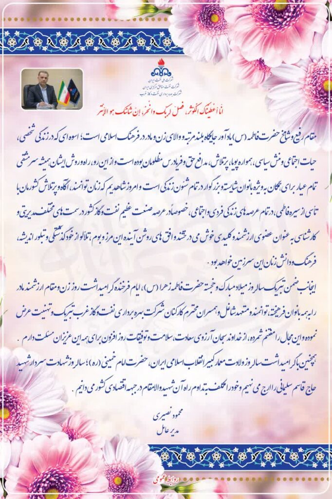 به گزارش پایگاه اطلاع رسانی شرکت نفت مناطق مرکزی ایران بر اساس مصوبه شورای فرهنگی_ورزشی شرکت مراسم نکوداشت فرخنده میلاد حضرت زهرا(س)، مراسم گرامیداشت مقام مادر و روز زن با حضور مهندس محمود نصیری مدیر عامل، مدیران، روسا و بانوان شاغل شرکت بهره برداری نفت و گاز غرب در محل هتل پارسیان کرمانشاه برگزار شد.