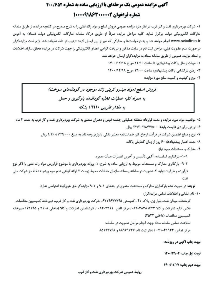 آگهي مزايده عمومي يك مرحلهاي با ارزيابي ساده به شماره 400/652 فروش اسلج و مواد زائد نفتي