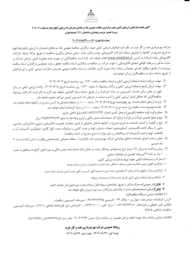 آگهی تجدید فراخوان ارزيابي كيفي جهت برگزاري مناقصه عمومي يك مرحلهاي همزمان با ارزیابی (يكپارچه) به شماره 404/04