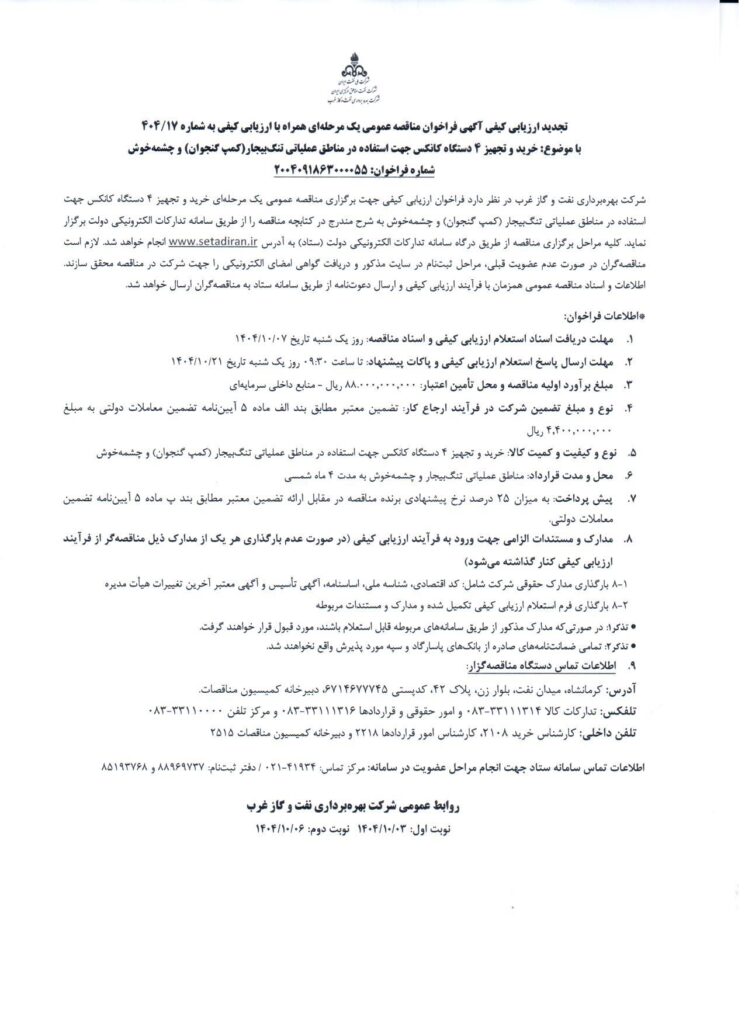 با موضوع: خرید و تجهیز 4 دستگاه کانکس جهت استفاده در مناطق عملیاتی تنگبیجار(کمپ گنجوان) و چشمهخوش