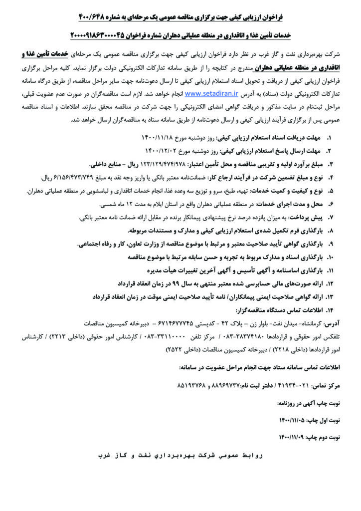 فراخوان ارزيابي كيفي جهت برگزاري مناقصه عمومي يك مرحله اي به شماره 400/648 خدمات تأمين غذا و اتاقداري در منطقه عملياتي دهلران