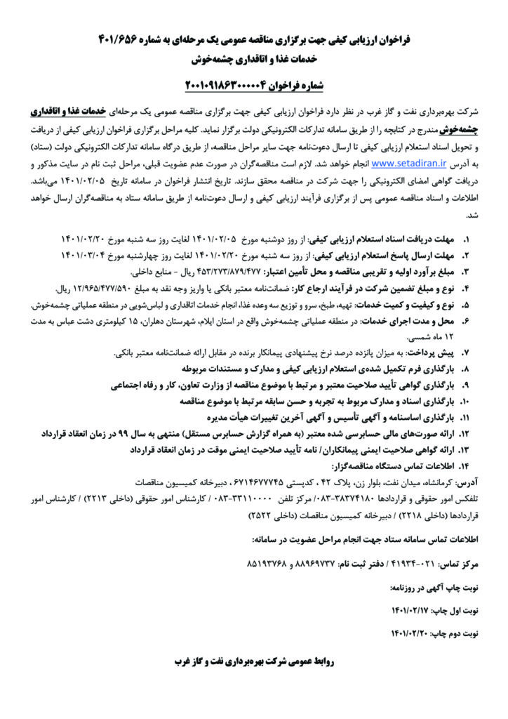 فراخوان ارزيابي كيفي جهت برگزاري مناقصه عمومي يك مرحله اي به شماره 401/656