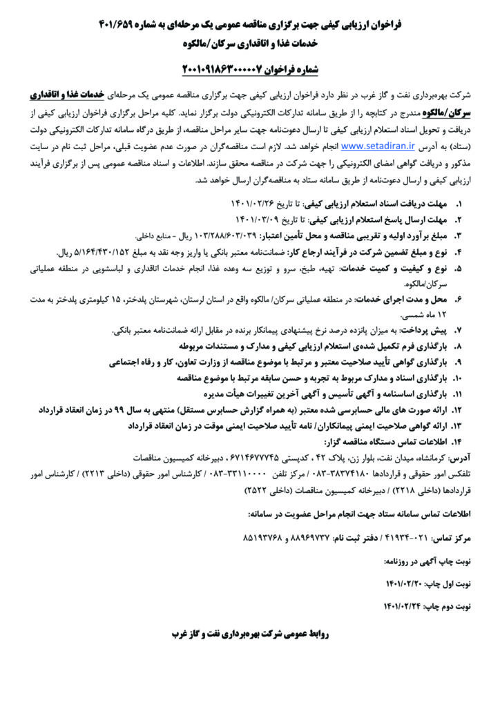فراخوان ارزيابي كيفي جهت برگزاري مناقصه عمومي يك مرحله اي به شماره 401/659