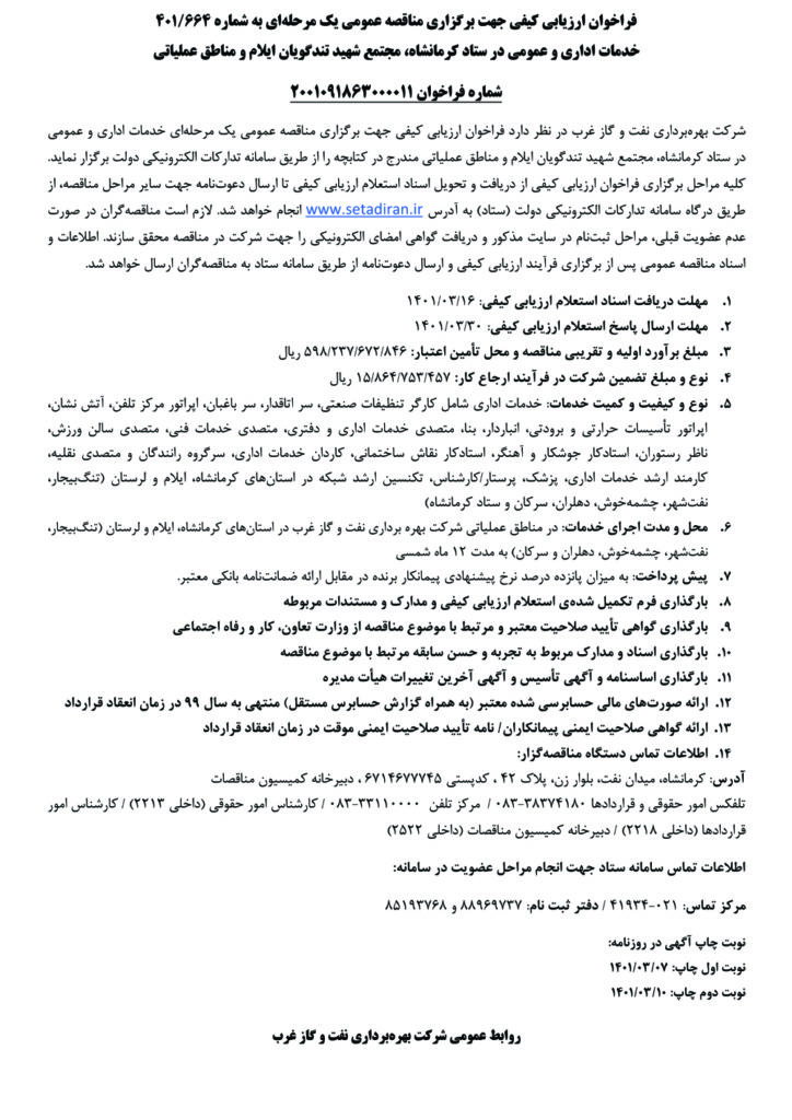 خدمات اداري و عمومي در ستاد كرمانشاه، مجتمع شهيد تندگويان ايلام و مناطق عملياتي
