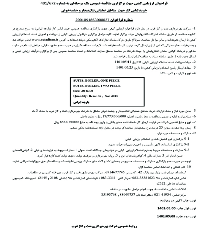 خريد لباس کار جهت  مناطق عملياتي تنگ‌بيجار و چشمه‌خوش