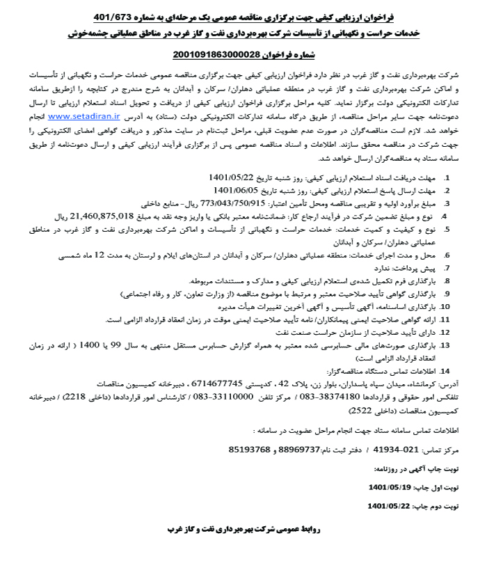 خدمات حراست و نگهبانی از تأسیسات شرکت بهرهبرداری نفت و گاز غرب در مناطق عملیاتی چشمهخوش