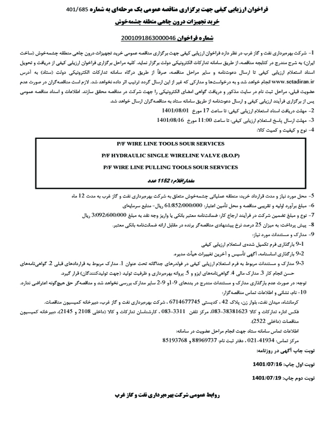 فراخوان ارزيابي كيفي جهت برگزاري مناقصه عمومي يك مرحلهاي به شماره 401/685