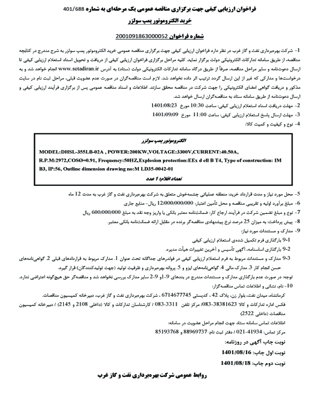 فراخوان ارزيابي كيفي جهت برگزاري مناقصه عمومي يك مرحلهاي به شماره 401/688