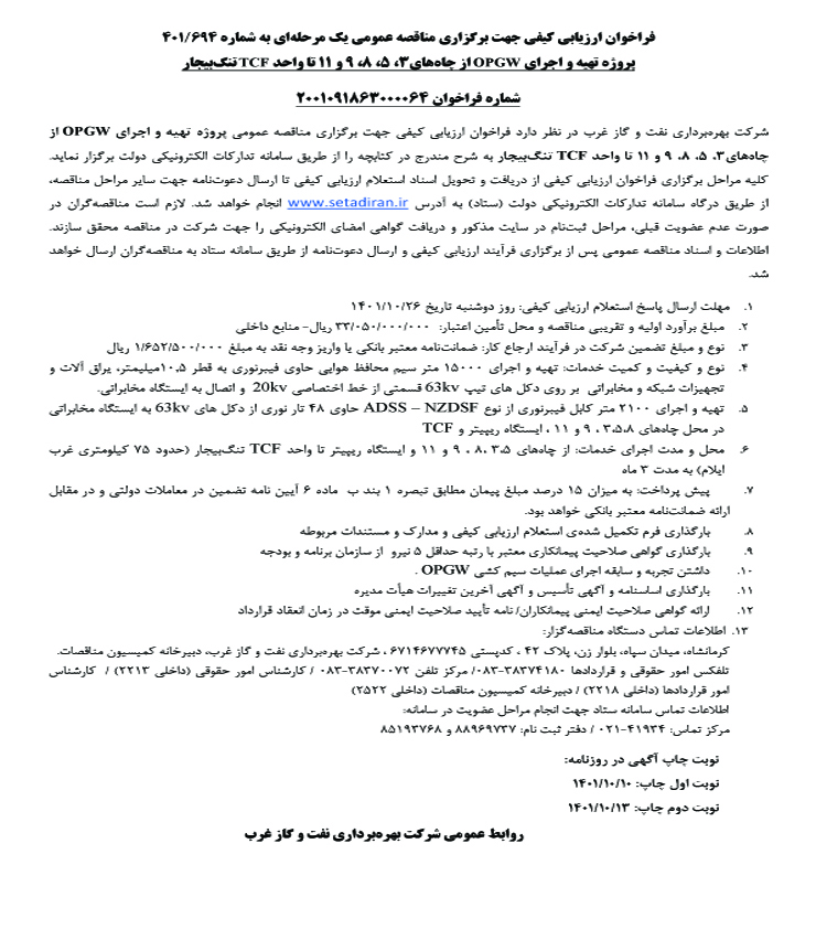 پروژه تهيه و اجراي OPGW از چاههاي3، 5، 8، 9 و 11 تا واحد TCF تنگبيجار