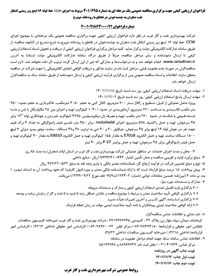 فراخوان ارزيابي كيفي جهت برگزاري مناقصه عمومي يك مرحله اي به شماره 401/695 مربوط به اجرای CCW خط لوله 16 اينچ زير زميني انتقال نفت دهلران به چشمهخوش در تقاطع با رودخانه دويرج