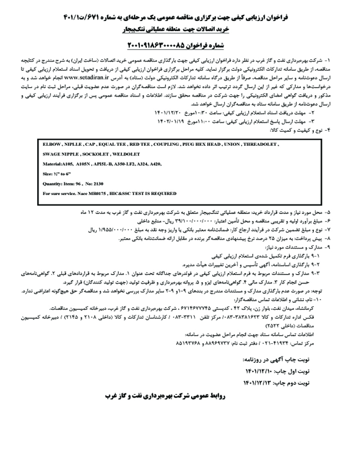 فراخوان ارزيابي كيفي جهت برگزاري مناقصه عمومي يك مرحلهاي به شماره 671/ ت1/ 401