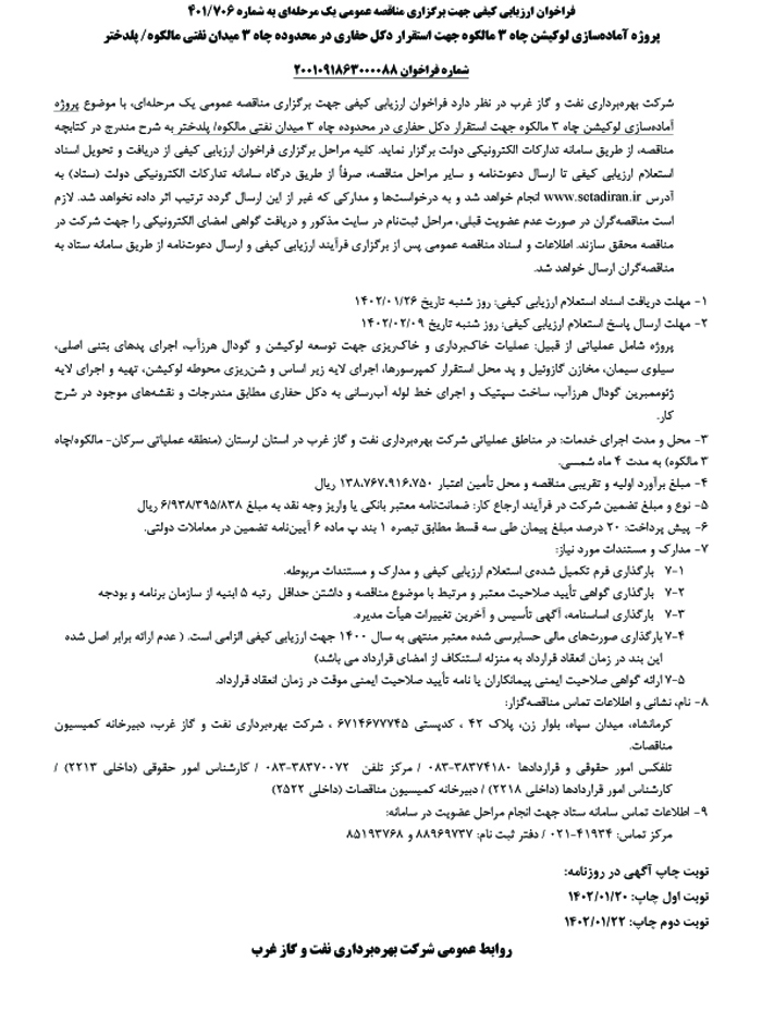 پروژه آمادهسازی لوکیشن چاه 3 مالکوه جهت استقرار دکل حفاری در محدوده چاه 3 میدان نفتی مالکوه/ پلدختر