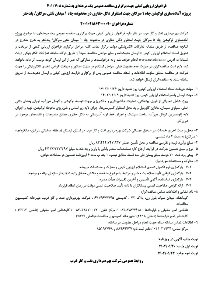 پروژه آمادهسازی لوکیشن چاه 1 سرکان جهت استقرار دکل حفاری در محدوده چاه 1 میدان نفتی سرکان/ پلدختر