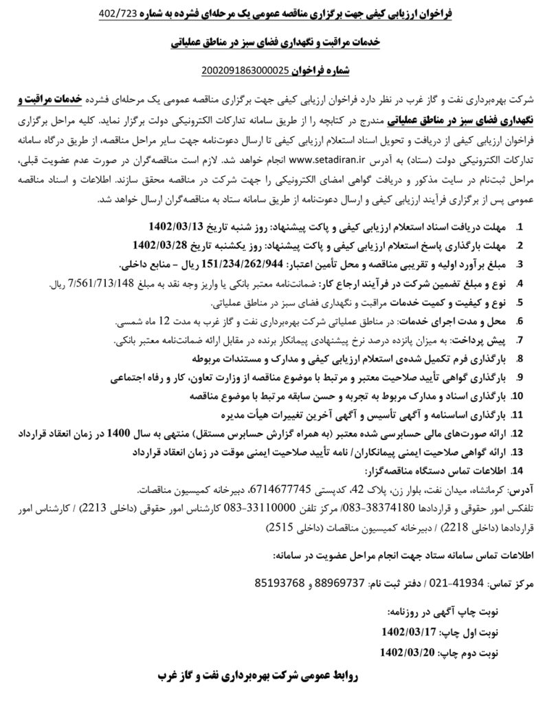 فراخوان ارزيابي كيفي جهت برگزاري مناقصه عمومی يك مرحله ­اي فشرده به شماره 402/723
