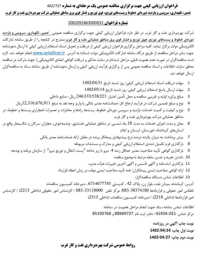 تعمير، نگهداري، سرويس و بازديد دورهاي خطوط و پستهاي توزيع، فوق توزيع و فشار قوي برق مناطق عملياتي شركت بهرهبرداري نفت و گاز غرب