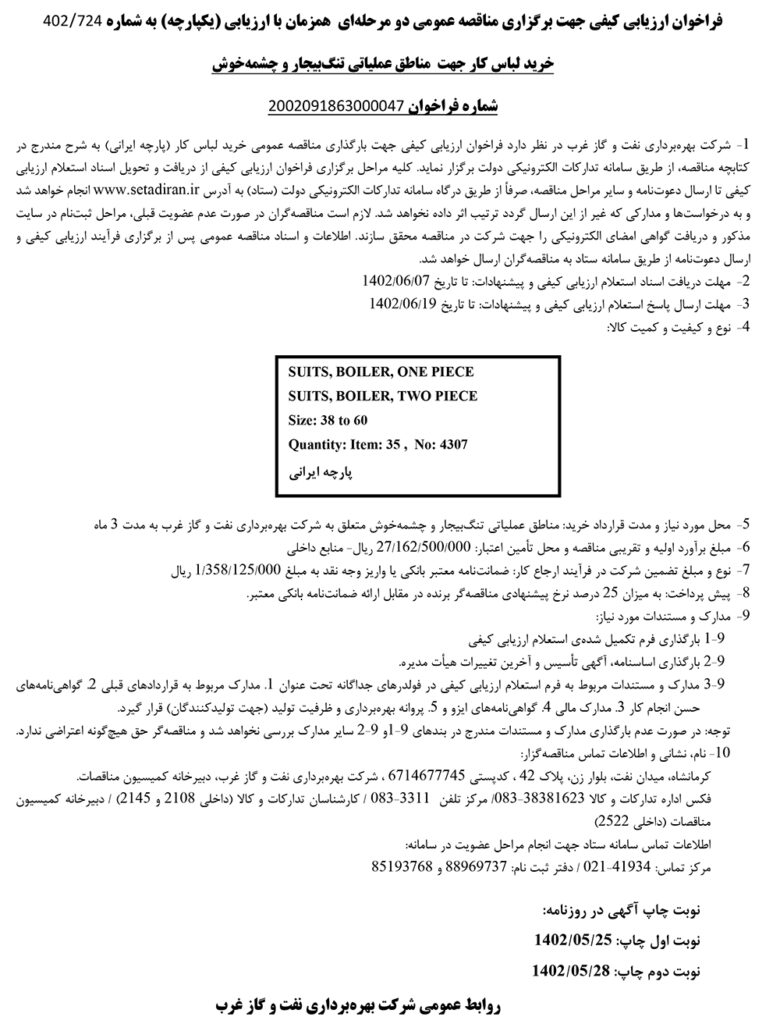 فراخوان ارزيابي كيفي جهت برگزاري مناقصه عمومي دو مرحلهاي همزمان با ارزیابی (یکپارچه) به شماره 402/724