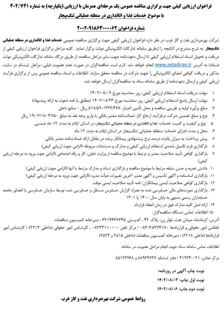 فراخوان ارزيابي كيفي جهت برگزاري مناقصه عمومي يك مرحله‌اي همزمان با ارزيابي (يكپارچه) به شماره 402/741