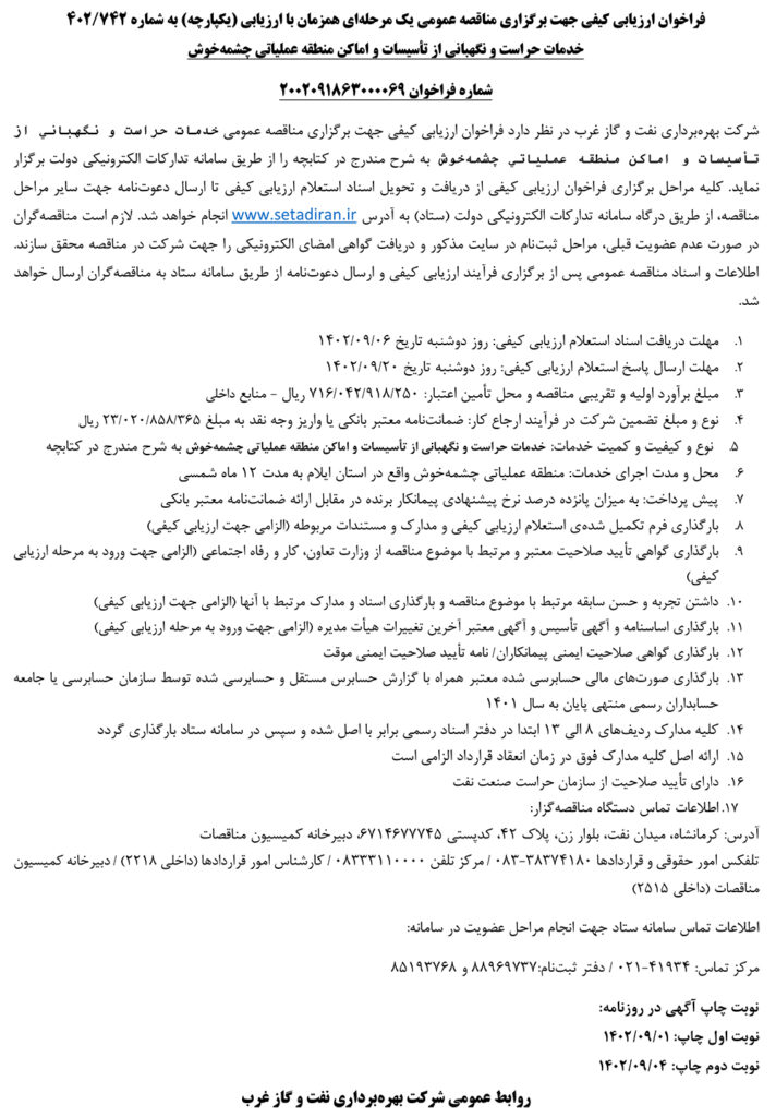 خدمات حراست و نگهباني از تأسيسات و اماكن منطقه عملياتي چشمهخوش