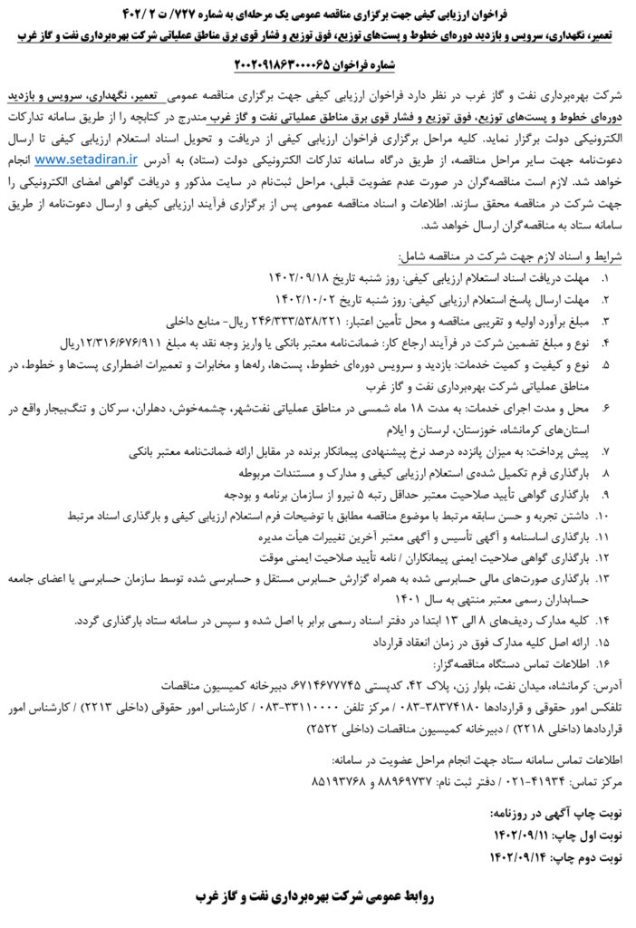 تعمير، نگهداري، سرويس و بازديد دورهاي خطوط و پستهاي توزيع، فوق توزيع و فشار قوي برق مناطق عملياتي شركت بهرهبرداري نفت و گاز غرب