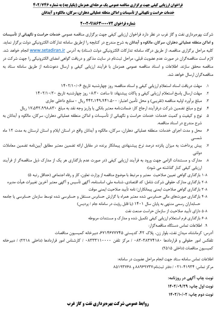 خدمات حراست و نگهباني از تأسيسات و اماكن منطقه عملياتي دهلران، سرکان، مالکوه و آبدانان