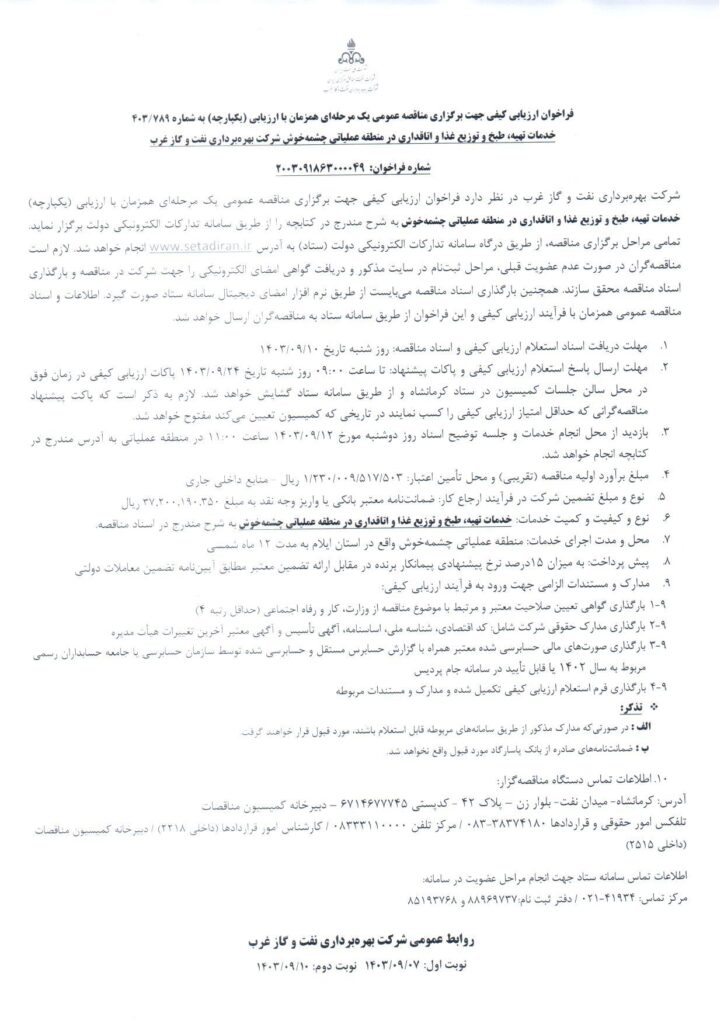 خدمات تهیه، طبخ و توزیع غذا و اتاقداری در منطقه عملیاتی چشمه‌خوش شركت بهره‌برداری نفت و گاز غرب