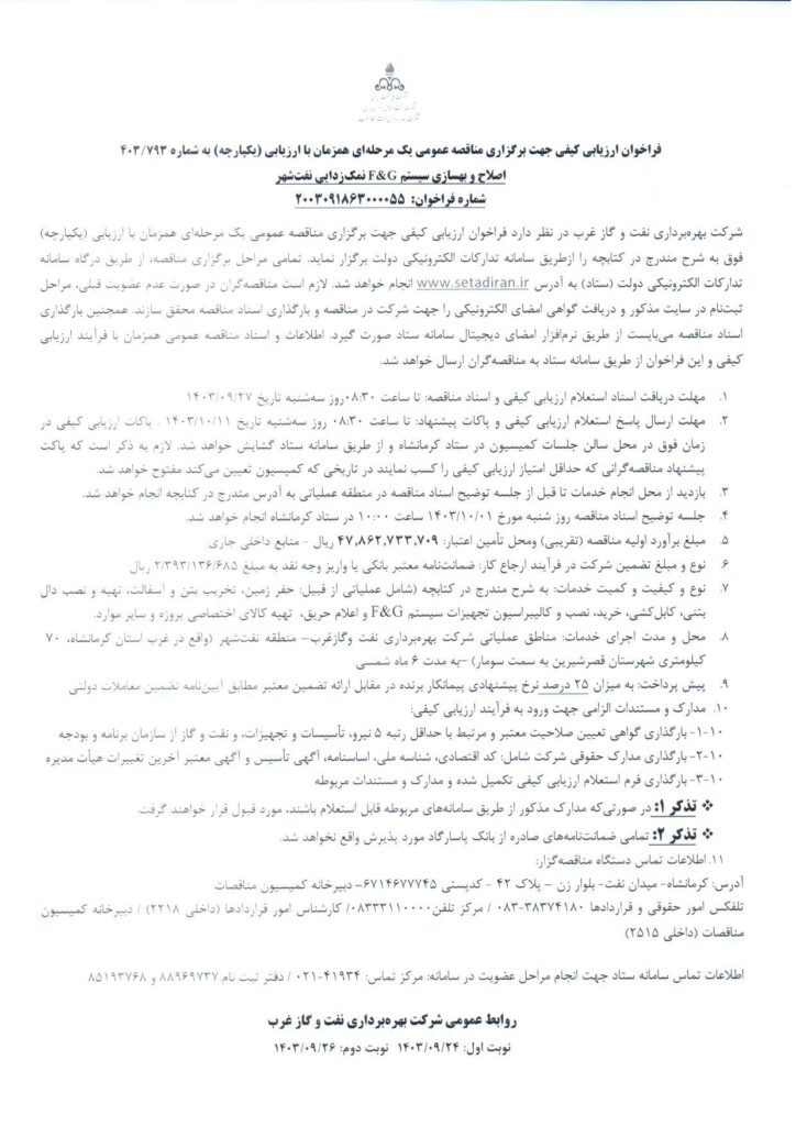 فراخوان ارزيابي كيفي جهت برگزاري مناقصه عمومي يك مرحلهاي همزمان با ارزیابی (يكپارچه) به 403/793