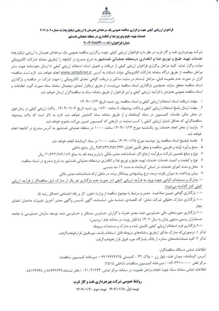 خدمات تهیه، طبخ وتوزیع غذا و اتاقداری در منطقه عملیاتی نفتشهر