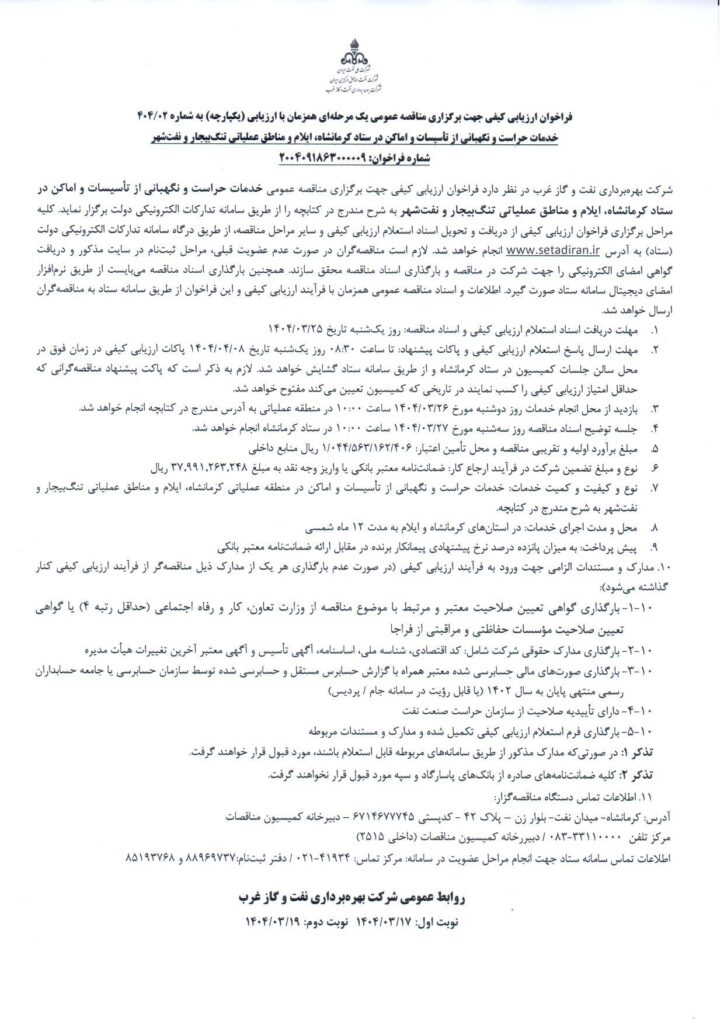 خدمات حراست و نگهباني از تأسيسات و اماكن در ستاد كرمانشاه، ايلام و مناطق عملياتي تنگبيجار و نفتشهر