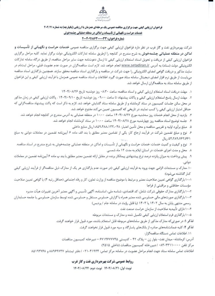 خدمات حراست و نگهباني از تأسيسات و اماكن در منطقه عملیاتی چشمهخوش