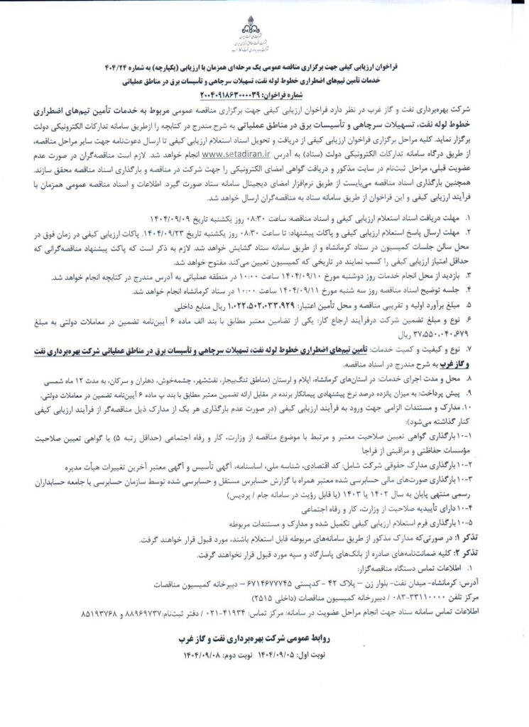 فراخوان ارزيابي كيفي جهت برگزاري مناقصه عمومي يك مرحله‌اي همزمان با ارزيابي (يكپارچه) به شماره 404/24