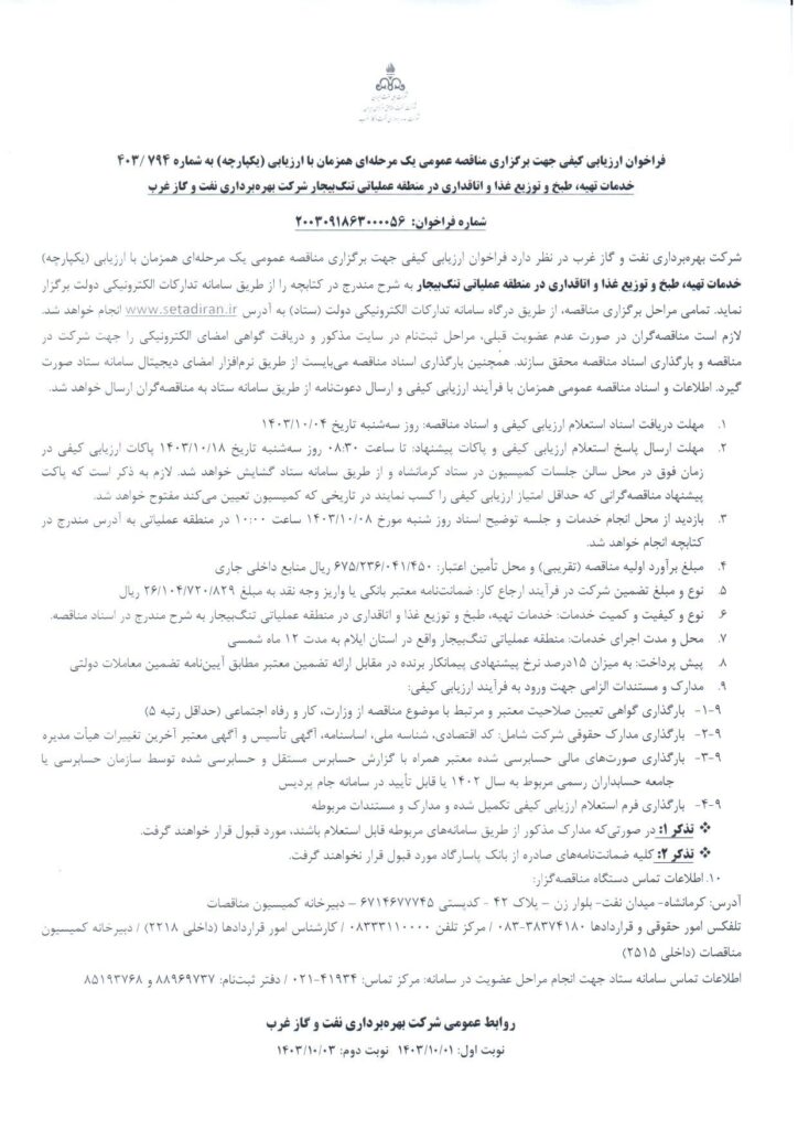 فراخوان ارزیابی کیفی جهت برگزاری مناقصه عمومی یک مرحله‌ای همزمان با ارزیابی(یکپارچه) به شماره ۷۹۴ /۴۰۳