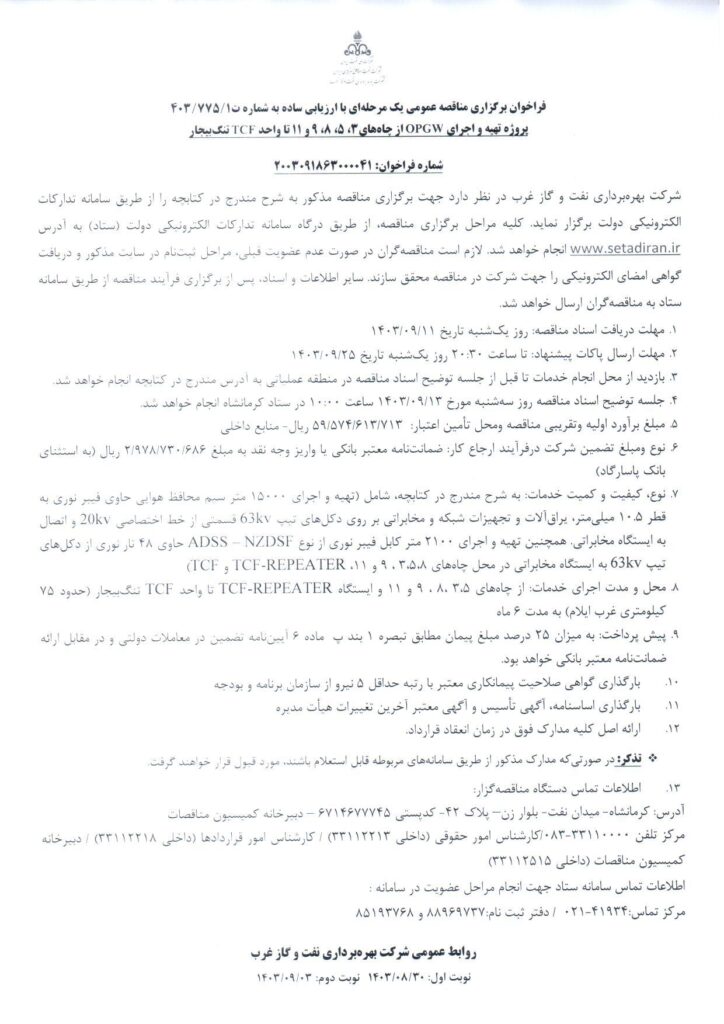 پروژه تهيه و اجراي OPGW از چاههاي3، 5، 8، 9 و 11 تا واحد TCF تنگبيجار