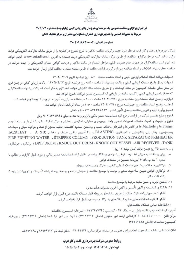 مربوط به تعمیرات اساسی واحد بهرهبرداری دهلران، نمکزدایی دهلران و مرکز تفکیک دانان