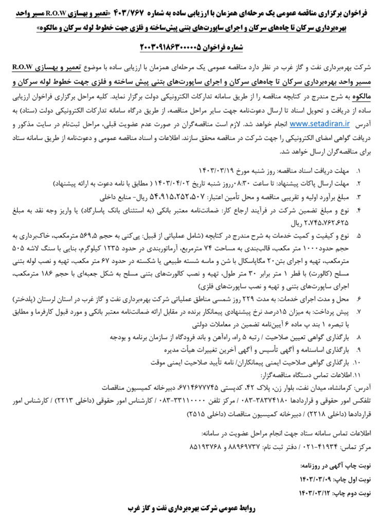 «تعمیر و بهسازی R.O.W مسیر واحد بهرهبرداری سرکان تا چاههای سرکان و اجرای ساپورتهای بتنی پیشساخته و فلزی جهت خطوط لوله سرکان و مالکوه»